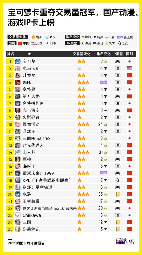 今年闲鱼平台国潮IP卡牌交易量飙升332%,其中哪吒卡牌断层领先,年度交易额超过1亿元,水浒、三国等经典名著卡牌热度大幅提升,水浒卡交易额涨超122%。2025年前三季度,影视综卡牌订单同比提升130%,国产剧集《永夜星河》《白月梵星》《难哄》《大梦归离》《赴山海》进入2025年度闲鱼平台影视综卡牌交易榜前五位。