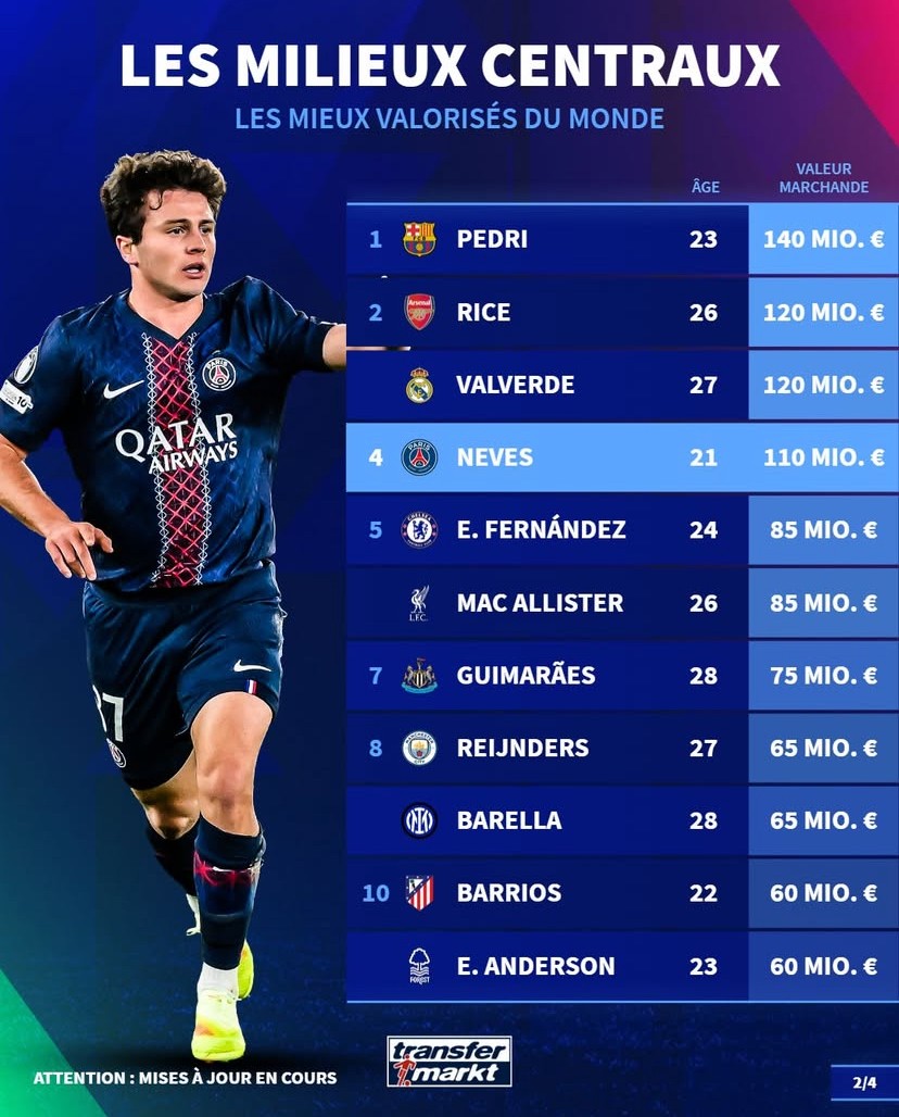 北京时间12月15日天天盈,在更新了法甲球员的身价之后,德转列出了目前世界足坛身价排名前10的中前卫,此次更新后身价涨至1.1亿欧元的若昂-内维斯排名第四,仅次于佩德里、赖斯以及巴尔韦德。